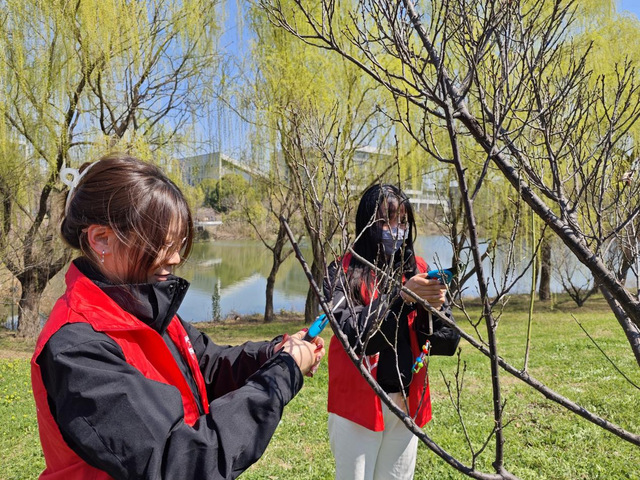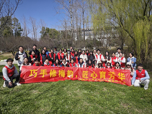 3月18日,A片网站 于江宁校区经管文楼南侧梅花林组织“巧手修梅韵,匠心育芳华”劳动教育主题实践活动。A片网站 党委书记丁素军、辅导员代表及药事管理专业本科生党支部成员共同参加。