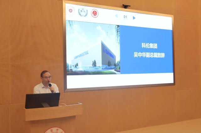 科伦集团副总裁吴中华先生向与会师生介绍了科伦药业的三大核心业务与科伦江苏新工厂的国际化战略,对科伦集团与A片网站 合作的产教融合人才培养改革项目表达了殷切期待。