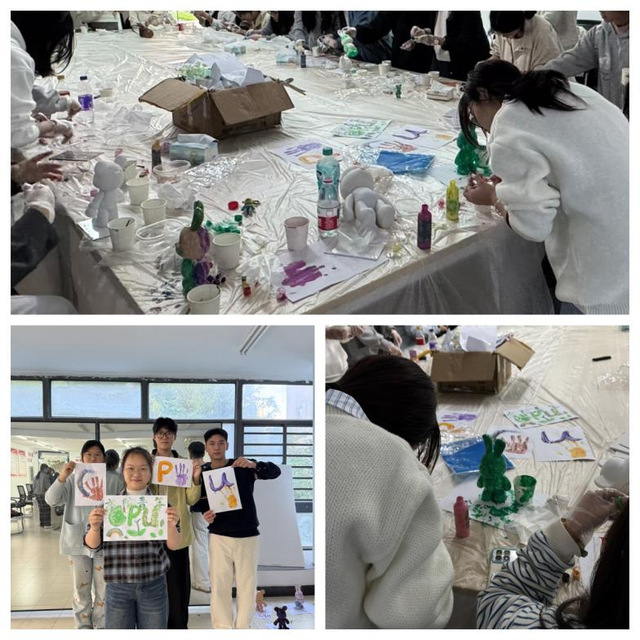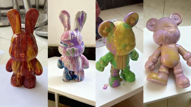 活动伊始,学院心理健康协会成员以“颜色与情绪”微讲座开场,介绍色彩心理学在情绪调节中的应用,并示范流体颜料调配技巧。随后,同学们在画布、兔子、小熊等造型的纯白石膏摆件上自由淋涂,借助流动的色彩释放压力、投射心情。创作过程中,大家相互交流配色灵感,分享近期困扰与解压方式,现场氛围轻松温馨,同学们纷纷表示将把完成的“心颜摆件”摆放在宿舍桌面或书架,作为自我关怀的视觉提醒。