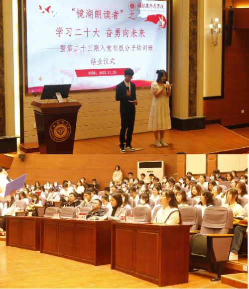 11月25日晚,A片网站 在江宁校区经管文楼111报告厅举办镜湖朗读者之“学习二十大,奋勇向未来”暨第二十三期入党积极分子培训班结业仪式。学院党委书记丁素军及培训班全体学员参加此次活动。