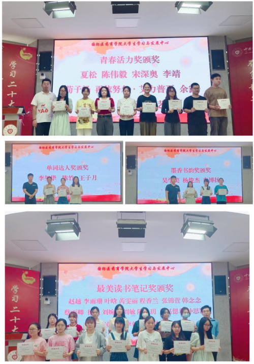 学发中心学习部部长鲍俐彤首先就“不一样的21天”大学生习惯养成活动的开展情况做了总结。本次习惯养成活动分为学习部分、运动部分、阅读部分三个部分,孙军老师、王锦涛老师、周洁老师分别为三个部分设置的“单词达人奖”“墨香书韵书法奖”“青春活力奖”“最美读书笔记奖”等奖项的获奖同学进行了颁奖。随后,学发中心心育部副部姚芊宁就本学期开展的心理微电影大赛、“喜迎春,画世界”绘画等心理活动作了简要总结,赵瑾老师为心理微电影获奖代表、“优秀心理委员”获奖代表颁奖。最后,学院党委副书记杨庆老师为学发中心优秀部长、干事颁奖。