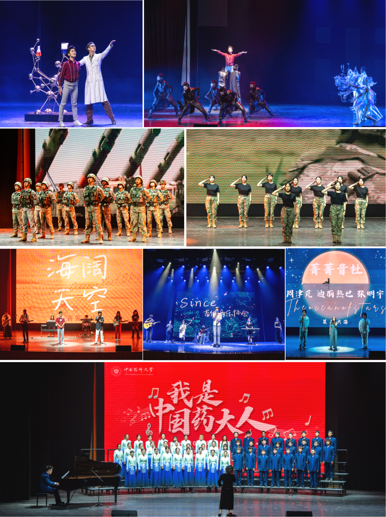 晚会以“我是中国药大人”为主线,分为“启航——情满药苑”“追光——兴药为民”“绽放——精业济群”三个篇章。在交响乐团热情洋溢、气势磅礴的《节日序曲》中拉开帷幕。文鸿朗诵团的原创朗诵《时代长风》,以壮阔嘹亮的青春誓言,讴歌时代强音。红叶舞蹈团以原创舞蹈《追光者》,勾勒属于当下中国的科学家群像,展现科学工作者们不畏艰难、无私奉献、勇于创新的良好精神风貌,并号召广大中国药大青年继承发扬新时代科学家精神,在追“光”逐梦的道路上奋斗不止。民乐团用一曲原创合奏《丝竹的交响》,以婉转优雅曲调抒发江南人民深爱故乡之情。学生社团带来的《海阔天空》《星辰大海》《夜空中最亮的星》等歌曲,以星空点亮青春,致敬奔赴理想的中国药大青年。军训教官们合唱《新时代最忠诚的兵》、舞蹈《请不要叫我女孩》,铿锵的旋律、飒爽的英姿都在号召着大家保持优良作风,努力成为祖国栋梁之材。各学院新生辅导员们带来的歌舞表演《新青年》,青春洋溢、充满能量,鼓励同学们站在人生新起点,满怀希望与信心,勇敢追逐心中梦想。凌霄合唱团的原创作品《神农》,谱写藥樂华章,传承神农精神;合唱《想要的一定要实现》将晚会气氛推至高潮,点燃新学年的理想与激情。最后,全场师生合唱《中国药科大学校歌》,用青春嘹亮的歌声共话中国药大人“精业济群、兴药为民”的使命担当。